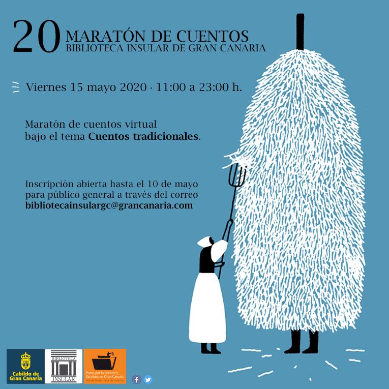 La 20ª edición del popular Maratón de Cuentos que la Biblioteca Insular del Cabildo de Gran Canaria celebra el día 15 de mayo, tendrá que desarrollarse virtualmente. El contratiempo de la pandemia del Covid-19 ha obligado al citado centro a celebrar las dos décadas de existencia de este evento que congrega a miles de personas en la Plaza de las Ranas, a través de las redes sociales y la página online de la biblioteca (https://bibliotecainsular.grancanaria.com) que gestiona la Consejería de Cultura.