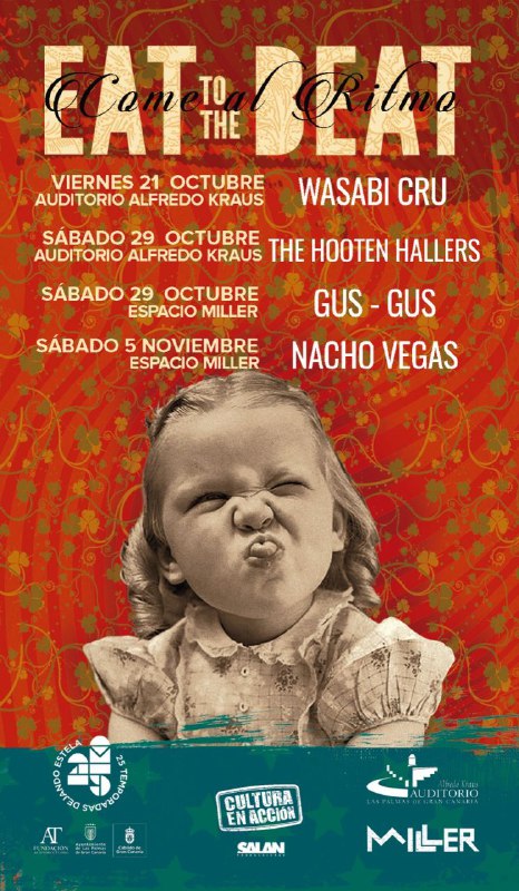 Cuatro artistas, dos internacionales y dos nacionales, protagonizan un ecléctico y bien templado menú sonoro con el que el ciclo de conciertos Eat to the Beat afronta su sexta edición, que se celebra en la capital grancanaria los próximos 21 y 29 de octubre y 5 de noviembre. Un proyecto organizado por Salan Producciones en colaboración con el Área de Cultura del Ayuntamiento de Las Palmas de Gran Canaria y la Fundación Canaria Auditorio y Teatro de Las Palmas de Gran Canaria, que este año presenta como novedad la incorporación del escenario del Espacio Miller, en el parque de Santa Catalina, junto a la sala Jerónimo Saavedra en el Auditorio Alfredo Kraus, en el que tendrán lugar dos de los cuatro conciertos de Eat to the Beat.