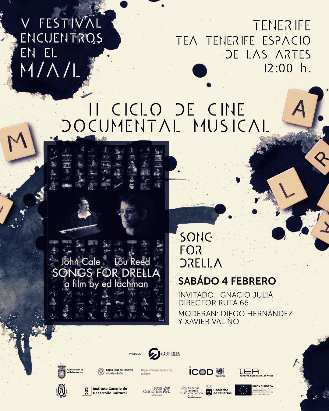El Ciclo de Cine Documental Musical, iniciativa que se enmarca en la V edición del Festival Encuentros en el M/A/L (Música, culturA y Letras) comenzará con la proyección de Song for Drella, un viaje artístico por el homenaje musical que Lou Reed y John Cale crearon para Andy Warhol, mentor y manager de The Velvet Underground. Tras la desaparición de la banda, Reed y Cale se reunieron, de forma breve, para grabar quince canciones que narran la vida, sueños y aspiraciones del mítico artista. Esta película se proyectará mañana, sábado 4 de febrero, a las 12 horas, con entrada libre, en TEA Tenerife Espacio de las Artes. A su finalización, comenzará un debate con Ignacio Juliá, cofundador de la publicación Ruta 66 y los periodistas Diego Hernández y Xavier Valiño.