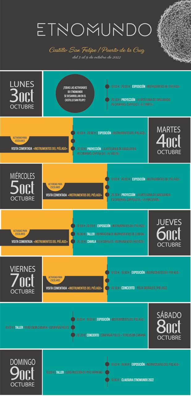 Esta muestra, que se desarrollará durante una semana en el municipio de Puerto de la Cruz (Tenerife), está basada en una programación de actividades que gira en torno a una exposición de instrumentos en el Castillo San Felipe —donde se celebrarán todas las actividades— con la que se pretende hacer llegar al público la riqueza y la variedad de nuestro patrimonio. El responsable de la misma, el musicólogo y multinstrumentista Félix Morales, facilitará la exhibición de aproximadamente ciento cincuenta instrumentos musicales procedentes de cinco continentes, dispuestos según criterios de época o procedencia y con información rigurosa sobre cada uno de ellos. Además, el propio Félix Morales ofrecerá una charla el jueves 6 de octubre a las 20:30 h sobre los instrumentos exóticos y un concierto en el que presentará Piélago el viernes 7 de octubre a las 20:30 h.