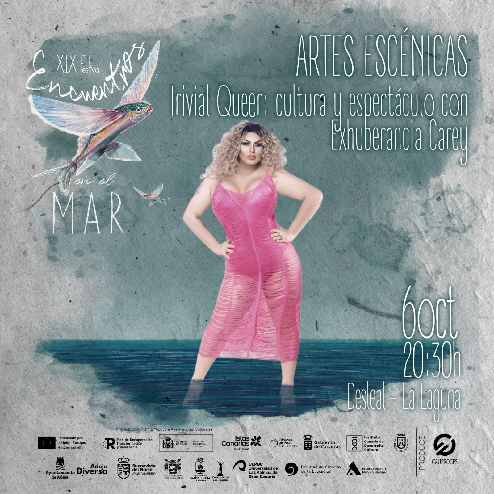 Actor transformista y gestor cultural, Exhuberancia Carey protagonizará Trivial Queer: cultura y espectáculo, dentro de la XIX edición del Festival Encuentros en el Mar:Trans*culturalidades, una actividad singular, desde la perspectiva de la disidencia y con la expresión artística como vehículo de diversidad e inclusión. Esta acción cultural tendrá lugar mañana, viernes 6 de octubre, con entrada gratuita hasta completar el aforo, en El Desleal, en San Cristóbal de La Laguna, a las 20:30 horas. Esta forma de visibilidad la creatividad y disidencia del colectivo LGBTIQ+, a través de una agenda cultural que cree espacios seguros, diversos e inclusivos es uno de los objetivos del Festival, que ofrece así una agenda alternativa que centra sus actividades en los ámbitos artístico, activista y reflexivo y que desarrollará en las próximas semanas, en Tenerife y Gran Canaria, propuestas desde disciplinas diferentes, como las artes escénicas, el monólogo o la fotografía, entre otras.