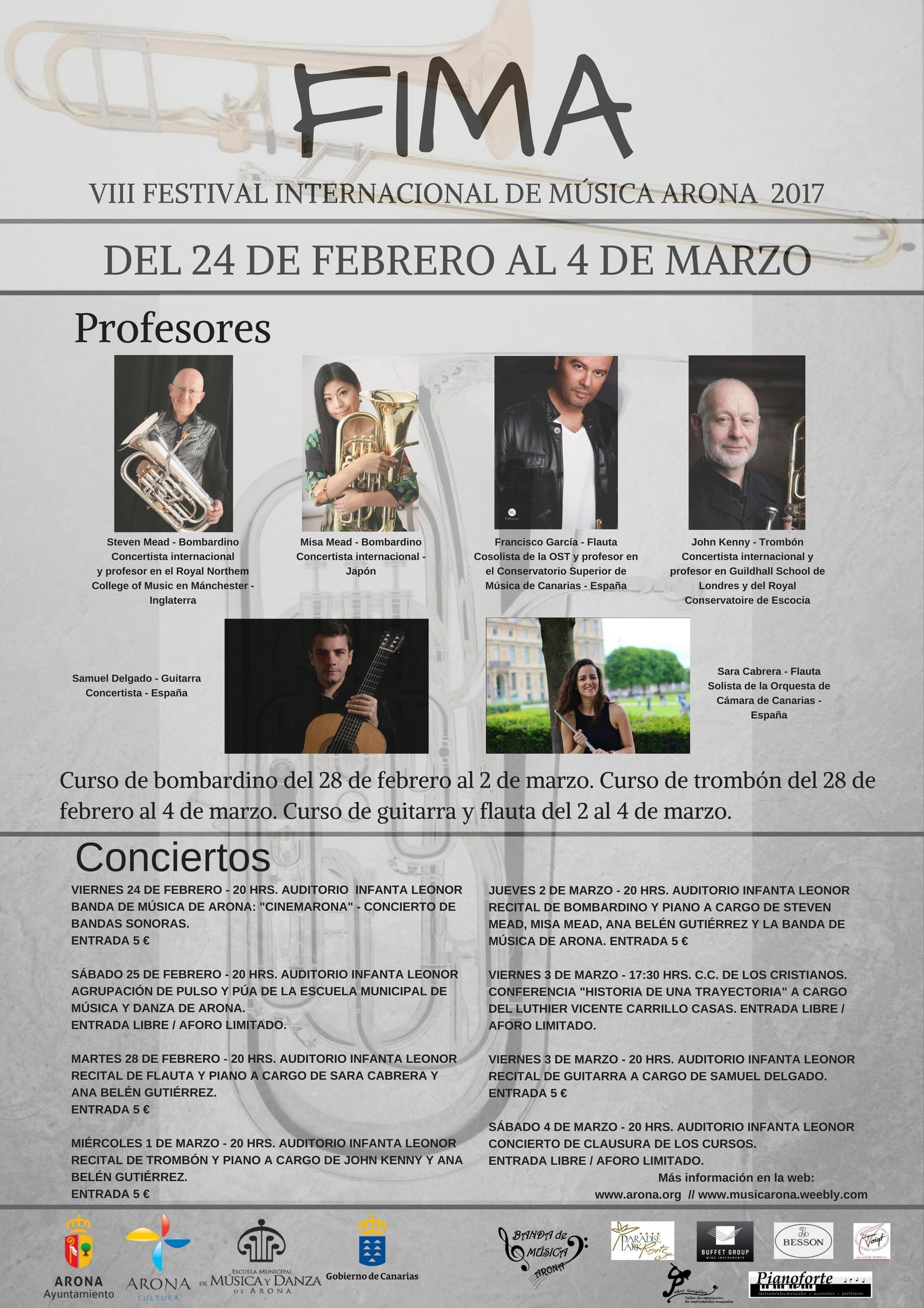 El Patronato de Cultura y la Escuela de Música y Danza, con la colaboración de la Asociación Sociocultural Banda de Música de Arona, organizan una nueva edición del Festival Internacional de Música de Arona (FIMA), una intensa semana dedicada a la mejor interpretación y la formación técnica que, este año, contará con la presencia del solista de bombardino Steven Mead, considerado uno de los mejores del mundo y profesor en el Royal Northern College of Music (Mánchester), y del trombonista John Kenny, galardonado este año con el Lifetime Achievement Award 2017 de la International Trombone Association y profesor de trombón en la Guildhall School of Music and Drama de Londres y en The Royal Conservatoire de Escocia. Además de diversos conciertos y una amplia oferta formativa, el FIMA ofrece como novedad este año una charla a cargo del luthier de guitarras Vicente Carrillo.