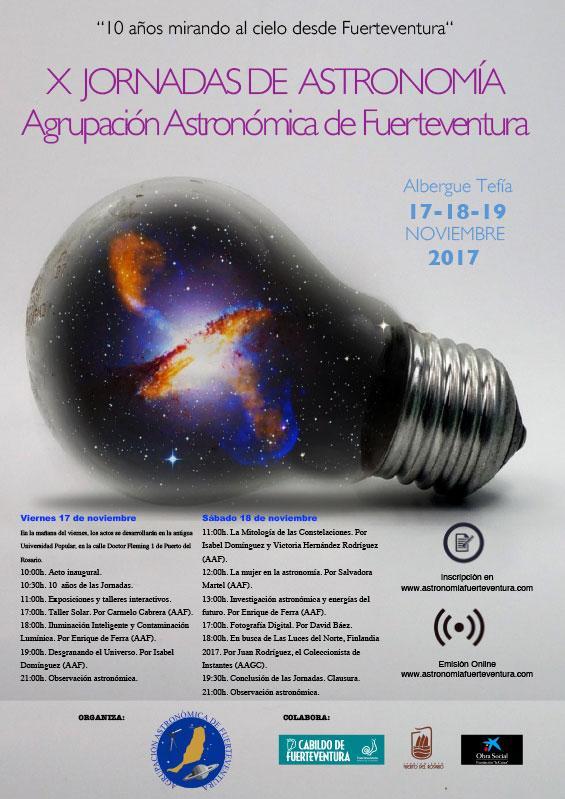 La Agrupación Astronómica de Fuerteventura celebrará del 17 al 19 de noviembre las X Jornadas de Astronomía, en colaboración con el Cabildo de Fuerteventura. Las actividades comenzarán durante la mañana de este viernes, día 17, en el Centro Insular de Juventud, ubicado en la antigua Universidad Popular de Puerto del Rosario. El resto de talleres y actos tendrán lugar en el Albergue Juvenil de Tefía.