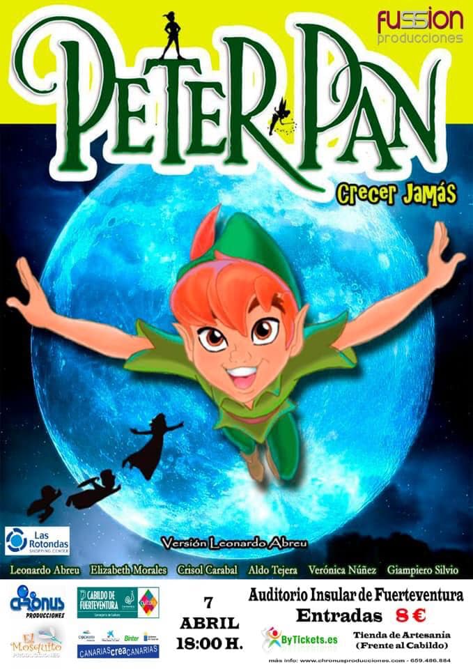 La obra infantil Peter Pan, Crecer Jamás llega este domingo, 7 de abril, al Auditorio Insular de Fuerteventura. El espectáculo será representado a partir de las 18.00 horas, dentro de las actividades culturales del Cabildo, que coordina Juan Jiménez.