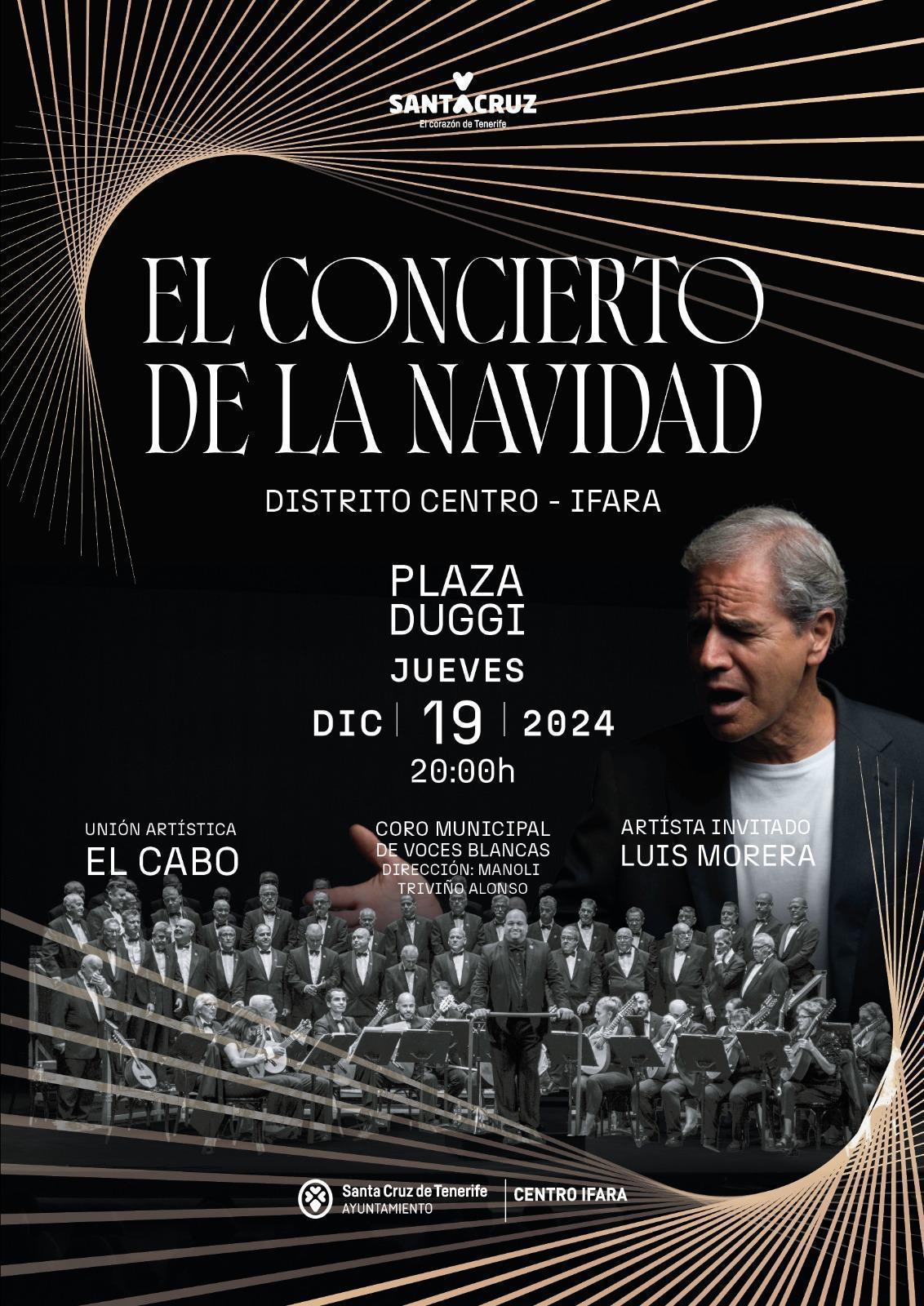 La plaza Duggi acogerá el próximo jueves, día 19, “El concierto de la Navidad” en el que actuarán la Unión Artística El Cabo, el Coro Municipal de Voces Blancas, y Luis Morera como artista invitado. El concierto, organizado por la oficina del distrito Centro-Ifara, comenzará a las 20:00 horas con entrada libre, y es uno de los principales actos dentro de la programación de Navidad del distrito.