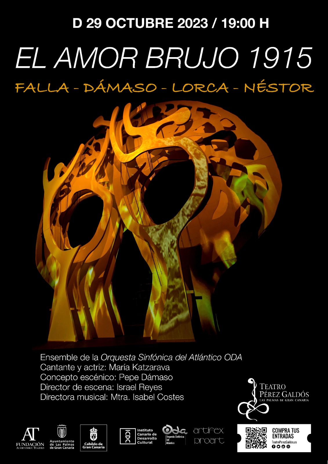 El segundo espectáculo, ‘El Amor Brujo (primera versión 1915)’, previsto a las 19:00 horas, se trata de una propuesta multidisciplinar en el que converge la genialidad de Manuel de Falla con el arte del creador Pepe Dámaso que, a partir de los decorados creados por Néstor Martín Fernández de la Torre en 1915, crea un concepto escénico sensacional, síntesis de los múltiples registros conceptuales “damasianos”. El montaje volverá a contar con la dirección musical de la maestra Isabel Costes y la dirección de escena de Israel Reyes, ofreciendo toda la dimensión y entidad artística que contiene la obra de Manuel de Falla y ciñéndose rigurosamente a la concepción original que los autores idearon en 1915, y cuya base radica en la utilización de una orquesta de solo 15 músicos a la que dotó del mayor grado de sonoridades y expresión que le permitió el reducido grupo instrumental, más cuatro personajes que giran en torno la protagonista, Candelas, protagonizado por la famosa cantante mexicana María Katzarava.