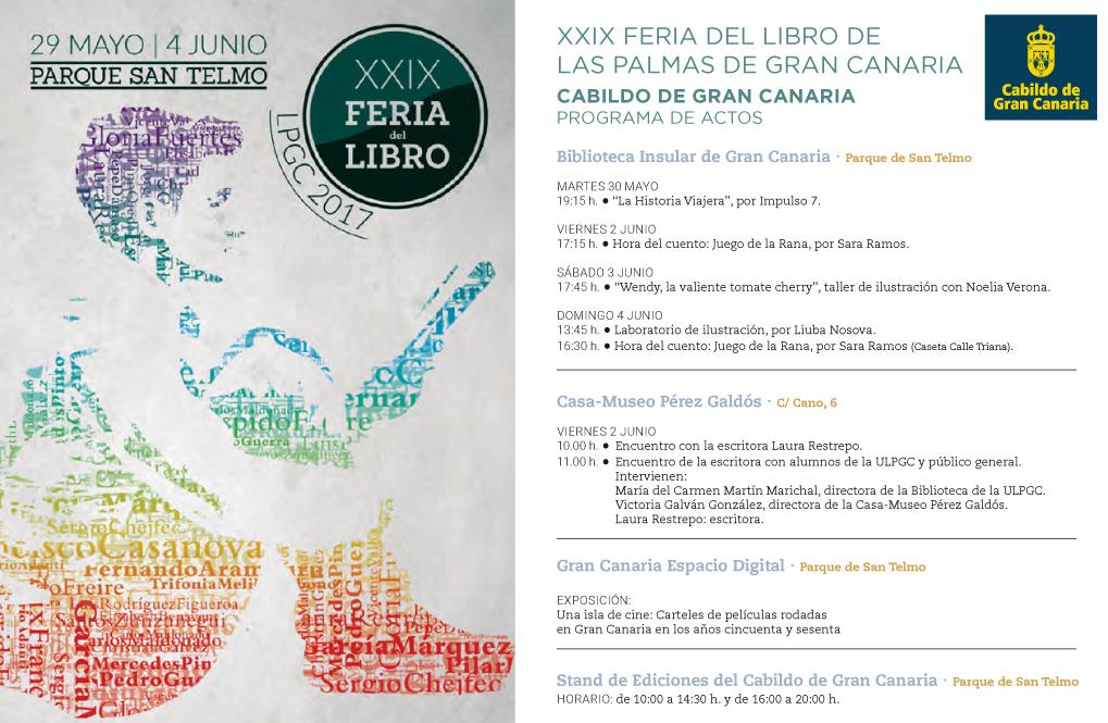 La Consejería de Cultura del Cabildo grancanario que dirige Carlos Ruiz desplegará con motivo de la 29º edición de la Feria del Libro de Las Palmas de Gran Canaria que tendrá lugar en el Parque de San Telmo, diversas iniciativas que van desde distintos talleres de ilustración y sesiones de cuentacuentos, a una exposición sobre carteles cinematográficos de películas rodados en la isla entre los años 50 y 60, pasando por un encuentro literario con la escritora y periodista colombiana Laura Restrepo que se desarrollará en la Casa Museo Pérez Galdós. Todo ello, sin contar con el estand institucional que se instalará en dicho evento en el que se mostrará buena parte del extenso fondo editorial publicado por el Cabildo en el que podrán adquirirse más de 200 títulos, entre los que destacan sus últimas novedades editadas.