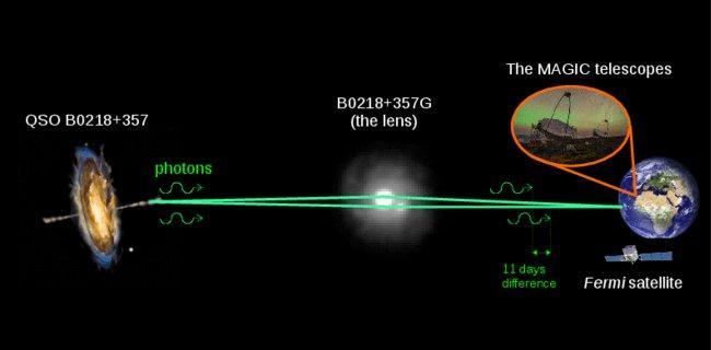 Con esta observación, MAGIC ha duplicado el rango de visibilidad del Universo en rayos gamma de muy alta energía. La observación de la señal retardada de QSO B0218 + 357 mostró, por primera vez, que estos fotones muy enérgicos también son desviados como indica la Teoría Relatividad General, y que al ser recibidos en el tiempo estimado podrían descartar algunas teorías de la estructura del vacío. Por el momento, esta observación demuestra una nueva capacidad de los observatorios de rayos gamma de muy alta energía y pone de relieve el potencial de la próxima Red de Telescopios Cherenkov (CTA, por sus siglas en inglés.).