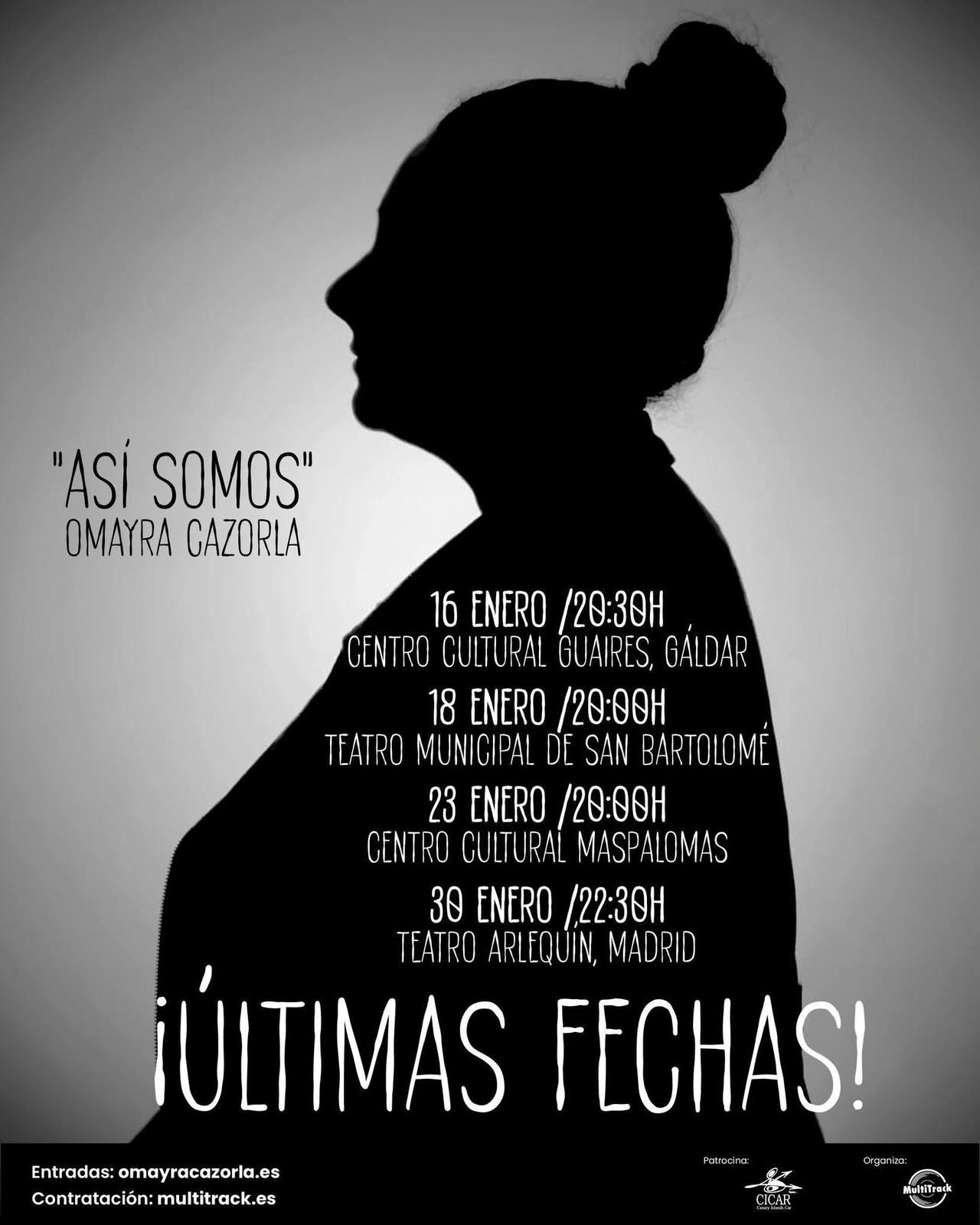 La humorista canaria Omayra Cazorla comienza el año 2026 sobre los escenarios para poner el punto finalde su gira Así somos, una propuesta escénica con la que ha recorrido los diferentes escenarios del Archipiélago durante el año pasado, y con el que ha conectado con el público desde la honestidad, la risa y la emoción. Las últimas fechas serán el 16 de enero en el Centro Cultural Guaires de Gáldar, el 18 de enero en el Teatro Municipal de San Bartolomé, el 23 de enero en el Centro Cultural Maspalomas y el 30 de enero en el Teatro Arlequín de Madrid.