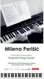 El Paraninfo de la Universidad de La Laguna acogerá hoy jueves 30 de junio a las 19:30 horas el concierto de la pianista y compositora Milena Perisic “Pequeño fuego verde”, basado en la colección de obras plásticas del Museo de Arte Contemporáneo Eduardo Westerdahl (MACEW). La entrada al acto y al aparcamiento del Edificio Central de la institución académica es gratuita. Además de por el museo, la velada está organizada por el Vicerrectorado de Relaciones con la Sociedad y el Instituto de Estudios Hispánicos de Canarias (IEHC).