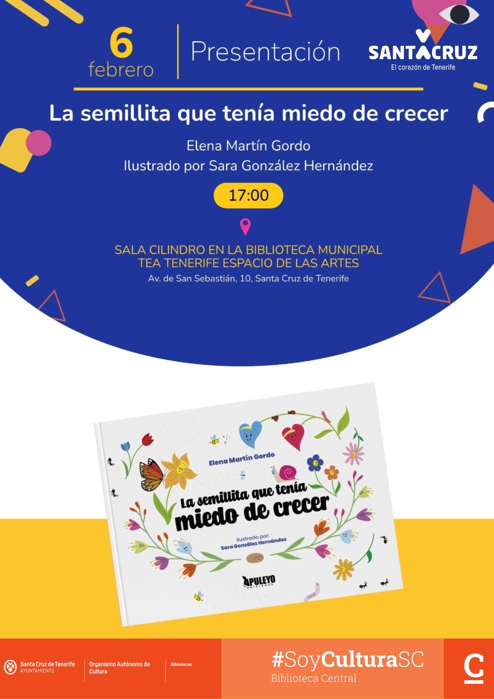 También mañana, a las 17:00 horas, la Biblioteca Municipal Central acogerá la presentación del libro “La semillita que tenía miedo a crecer” (Apuleyo, 2025), de la autora Elena Martín Gordo. El acto tendrá lugar en la Sala Cilindro, hasta completar aforo, y propone un cuento sensible y cercano que aborda el miedo a los cambios, la confianza en uno mismo y el valor de crecer a tu propio ritmo.