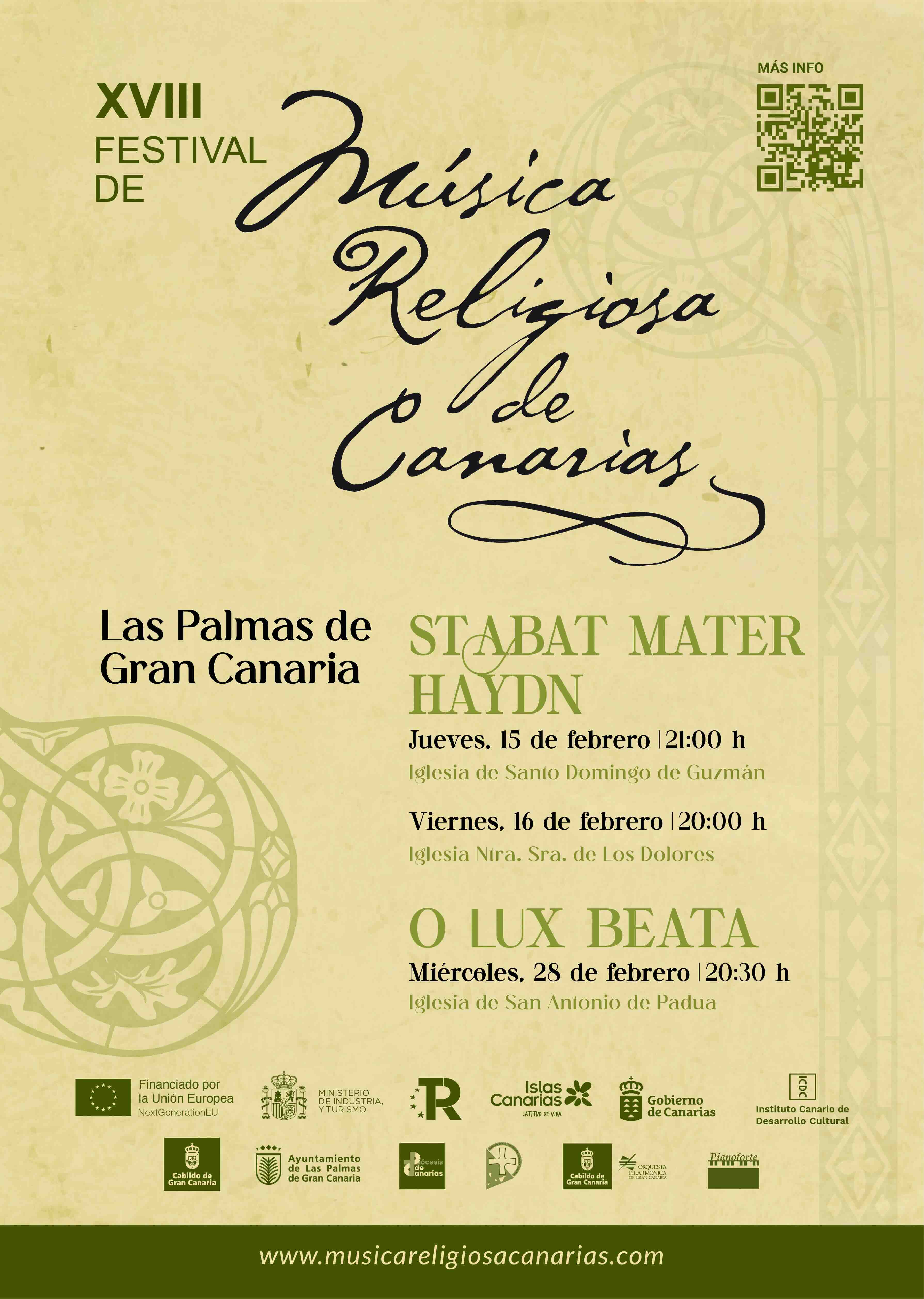 El XVIII Festival de Música Religiosa de Canarias inicia su andadura el jueves, 15 de febrero, con el concierto Stabat Mater Haydn, obra religiosa cumbre del compositor austriaco, y que se podrá escuchar, con una formación que se presenta por primera vez, en Gran Canaria y en Tenerife.
