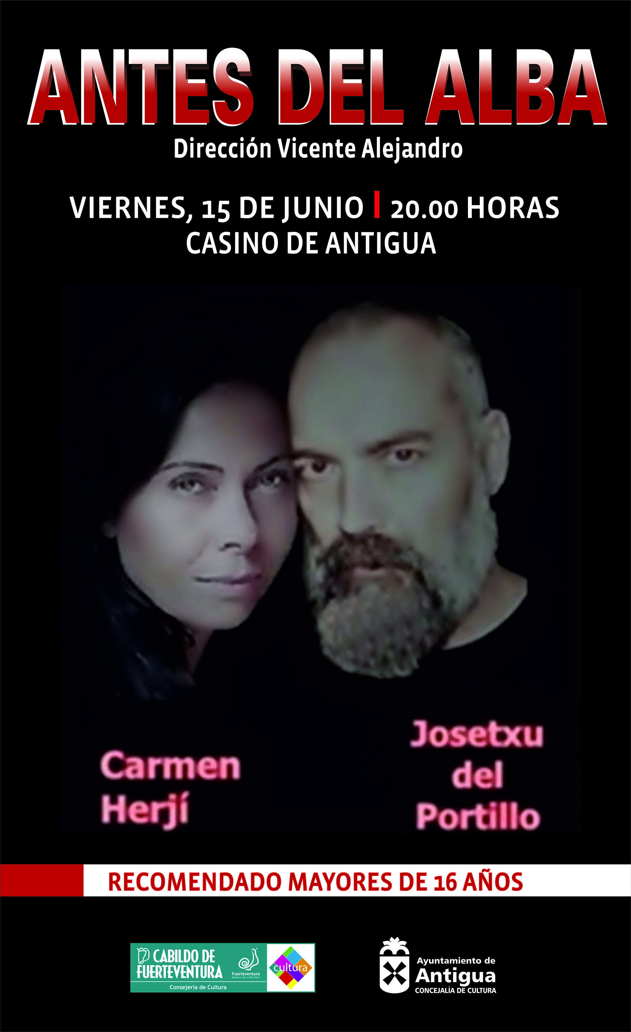 La colaboración que mantienen las áreas de cultura del Cabildo de Fuerteventura y el Ayuntamiento de Antigua permite que este viernes a las 20:00 horas en el Casino de Antigua, podamos disfrutar de la representación teatral Antes del Alba, interpretada por el actor Josetxu Portillo, la actriz, Carmen Herjí y dirigida por Vicente Martín, todos ellos residentes en Fuerteventura y con una dilata trayectoria teatral mostrada en numerosos trabajos escénicos presentados en la isla en los últimos diez años.